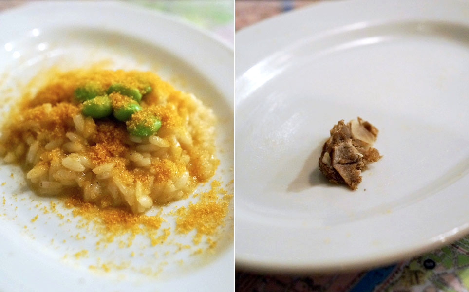 塩の旨味で素直に作ったリゾットに、枝豆散らしてタップリカラスミ。オリーブオイルで仕上げたモノで、米のホツホツ、豆のコツコツがとてもたのしく、カラスミの味わいひきたておいしくさせる。