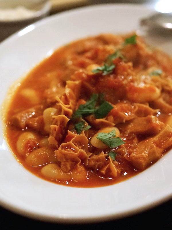 白インゲンと一緒にトマトと赤唐辛子で煮込んだモノ。つまりアラビアータ仕立ての料理で、ムッチリとしたトリッパの肉感的にウットリします。