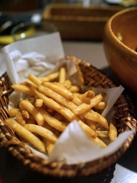 シューストリングの状態の細く切られたじゃがいもをサクッと二度揚げ。
