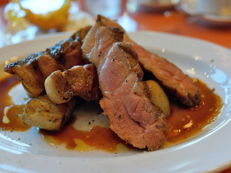 分厚い豚のばら肉をジャガイモと一緒にローストしたもので、断面ロゼで、つやつや目にもみずみずしいのにウットリします。