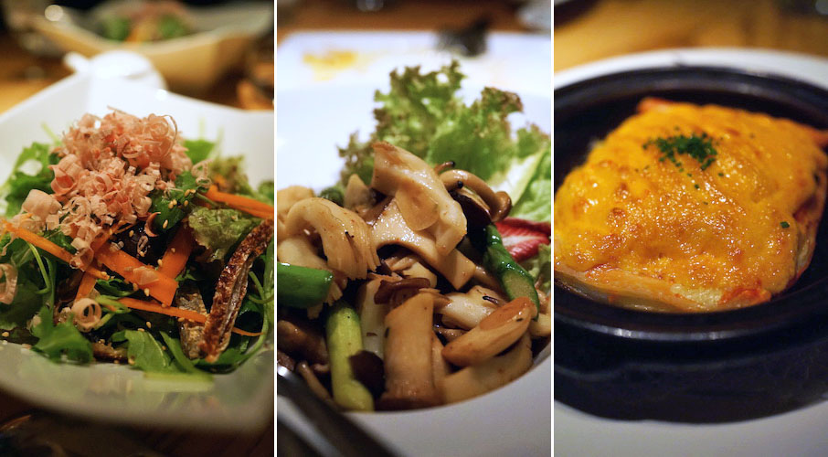イカとキノコや野菜をガーリックオイルで炒めた、パスタ仕立ての料理であったりズワイの味にとびっこ混じりのオランデーズソースをまとわせ焼き上げたモノ。