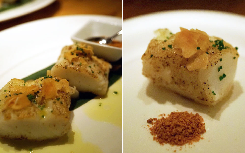 メロのパンソテ…、フライパンでガーリックオイルでソテしたモノを、ドライ味噌で味わう趣向。