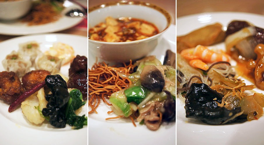 鶏の唐揚げ、肉団子、炒め料理に春雨サラダや春巻き、それからシュウマイ。