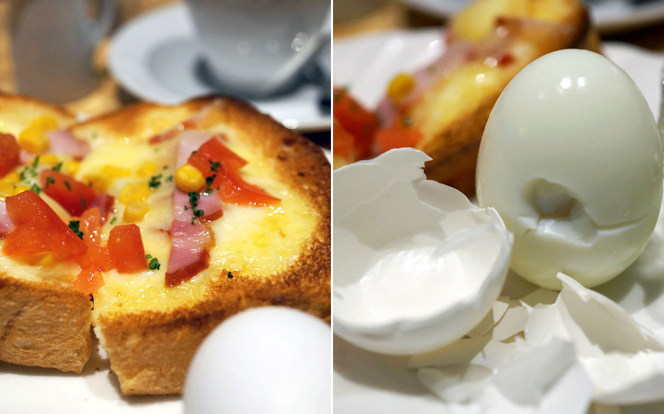 ほどよき厚さのトーストブレッドでこんがり焼いたピザトースト。コロンと小さな茹で卵。それで朝のひと揃え。