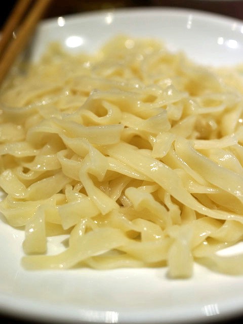 〆は鍋のスープで味わう麺で、平打麺をスープにくぐらせるだけ…、なのにスープが味わい見事でただそれだけで十分おいしい。