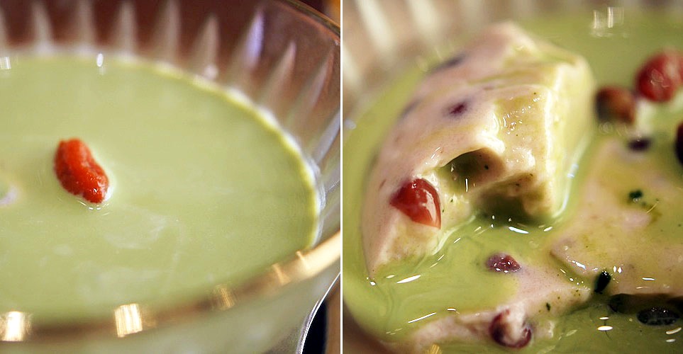 緑色したソースが覆ったその表面をスプーンですくって崩すと中から、甘くふっくら煮た小豆がゴロンゴロンと飛び出してくる。