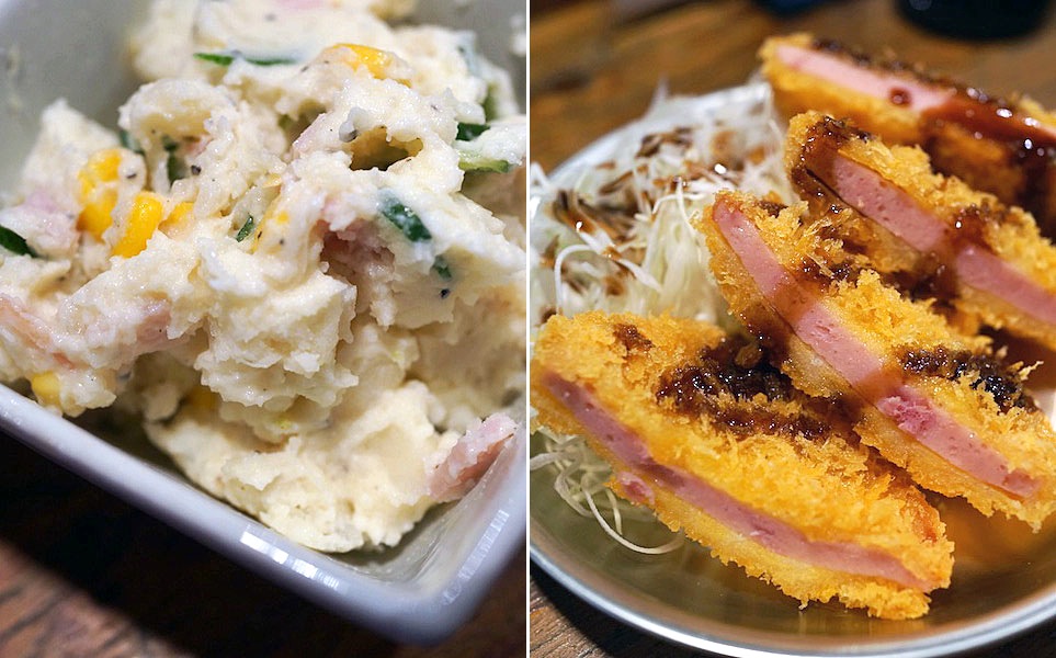 めっけ物がハムカツで、分厚いソーセージタイプのハムにパン粉をキレイにまぶして、カラッと揚げて熱々、しかもムッチリ旨い…、とんかつソースをタップリかけるとこれまたビールやホッピー、ハイボールなんかにあう味わい。