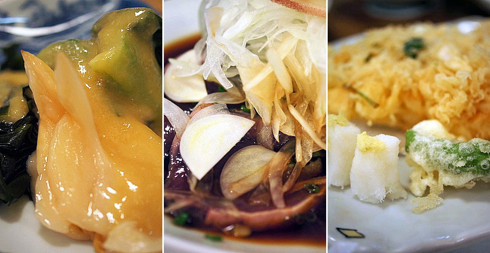 青柳のヌタ…、なんでヌタって自分で作るとおいしく出来ない料理なんだろうってみんなで言いつつプリプリ、シャキシャキ味わって、カツオポン酢をネットリ食べる。