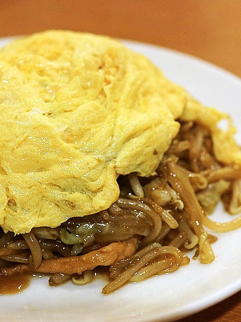 五目野菜炒めに卵焼きを帽子のようにのっけたモノで、北京ダックのようにこれを味噌と一緒に薄皮でくるんで食べたりする料理。