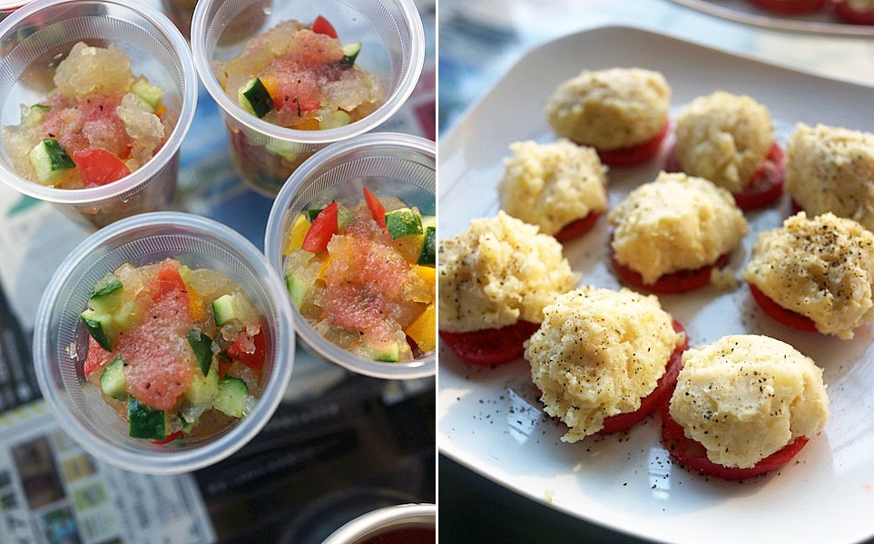 刻んだ野菜に冷たいドレッシングをかけるとこれが、ガスパチョみたいな味になるのもまたオモシロく、これを使っていろんな料理に応用できそう…、と、みんなでパクパク食べながら話が次々、盛り上がる。