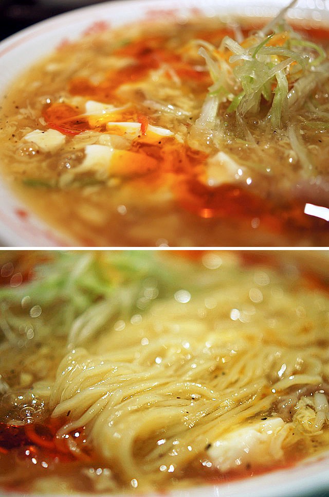 お酢と胡椒をタップリくわえて、極細麺にからみつくとろみスープをトロリと食べます。