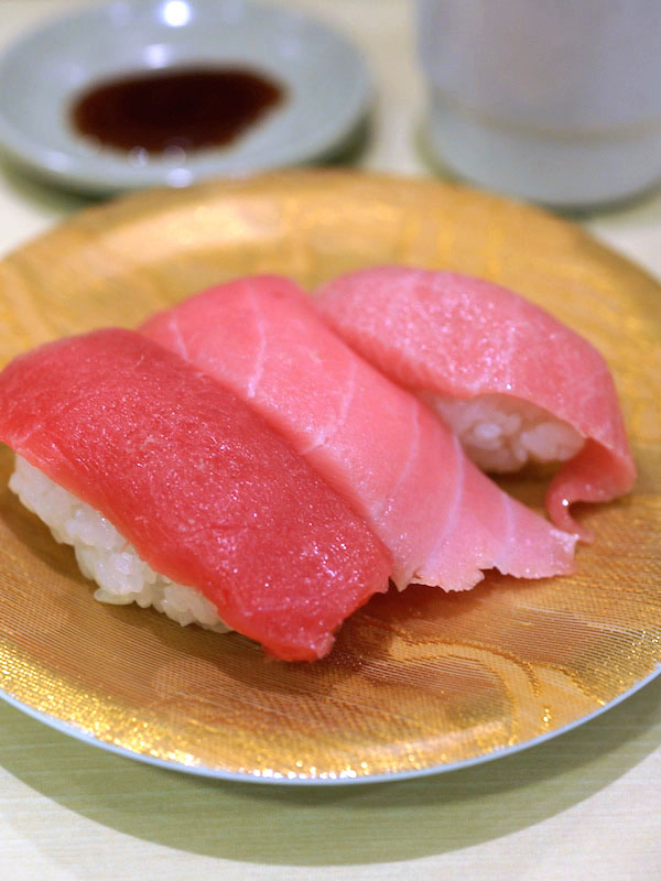 すしざんまいといえばマグロでございましょう故、本マグロの三点盛りをまずたのむ。メニューにあって、流れていない高級ネタ。かなりの数が出ているようで、注文するたび必ず「本マグロ」と「本」をつけるところに気合を感じたりする。