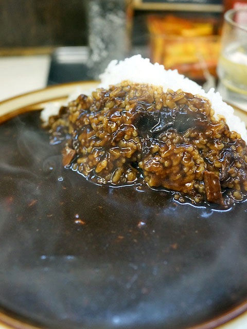 ココのカレーはツヤツヤとした黒いカレーで、焦がしたラードやバターがこういう色の基本をなしてるんでしょう…、サラサラしてるのにコッテリ旨い。