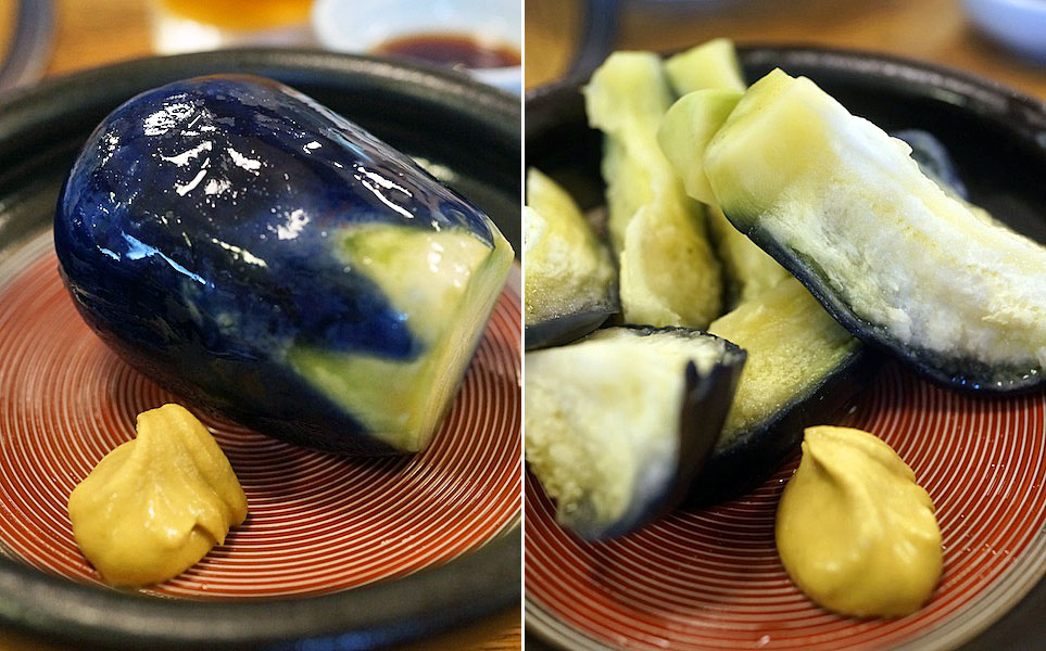 大きくツヤツヤ浸かった茄子を手で裂きながら味わう今が盛りのゴチソウ…、裂くと中からおいしい茄子の水気が出てきてそれで芥子を溶いて浸してパクリと食べる。