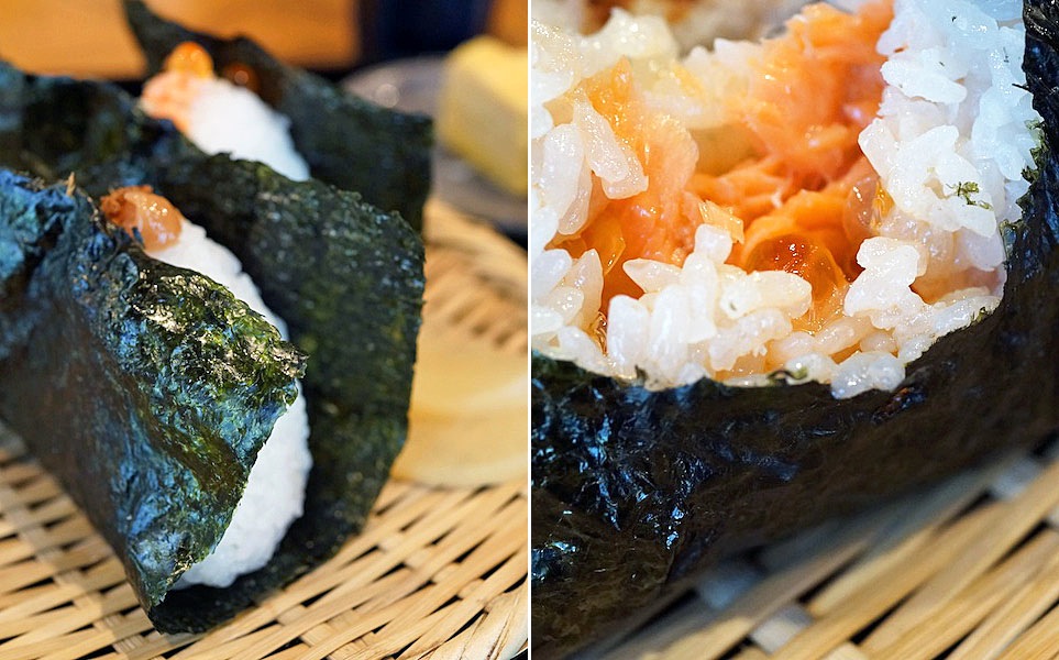 さぁ、召し上がれの合図にパクリと…、酸味よりもうま味がしっかりした梅干しとカツオのうま味で口の中がよだれで満ちるおむすびに、イクラが潰れてご飯が濡れてみずみずしくさえなる鮭とイクラのおむすびを代わる代わる食べて味わう。