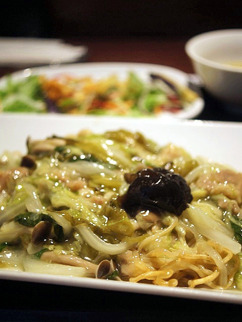 塩味のとろみのあんがコッテリおいしく、ネギにシメジに春雨、白菜。