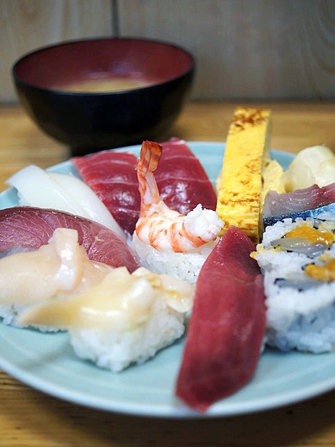 まぐろにカツオ、生鯖、貝にエビと色とりどりで、どれもキラキラ、見るからネタが新鮮でいい。