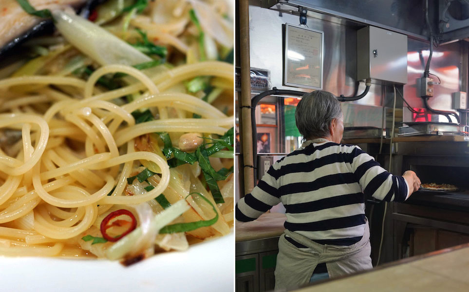 注文が入ってから麺を茹で、サンマもそれから二枚におろす。骨をのぞいてオリーブオイルと出汁で蒸し焼き。ネギはこんがり焼き上げる。