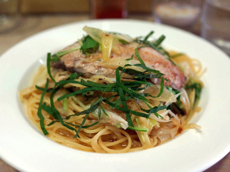 秋の魚をおいしく食べる、今の季節のスパゲティーサンマとネギのペペロンチーノを選んでたのむ。