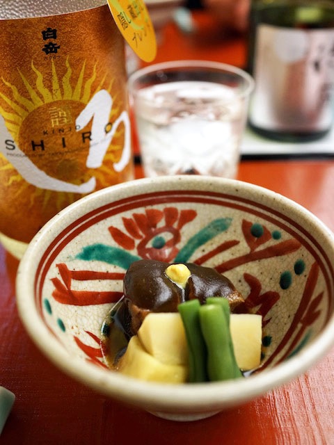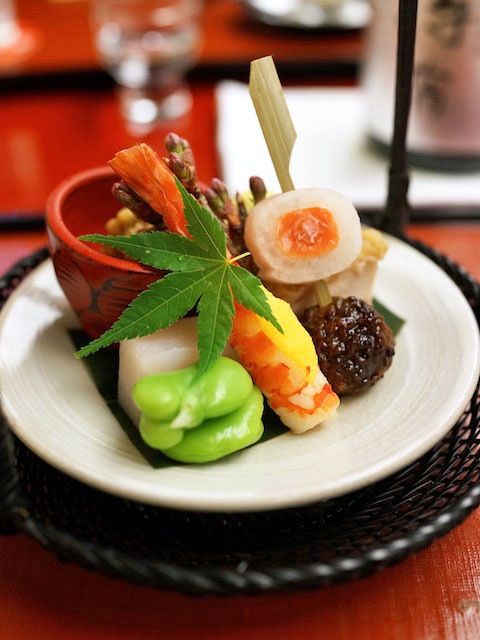 冷たい前菜…、茹でたそら豆、エビの黄身寿司、だし巻き玉子と色とりどりの料理がひとつに盛り合わされた季節の料理をつまみつつ、会話も弾む。
