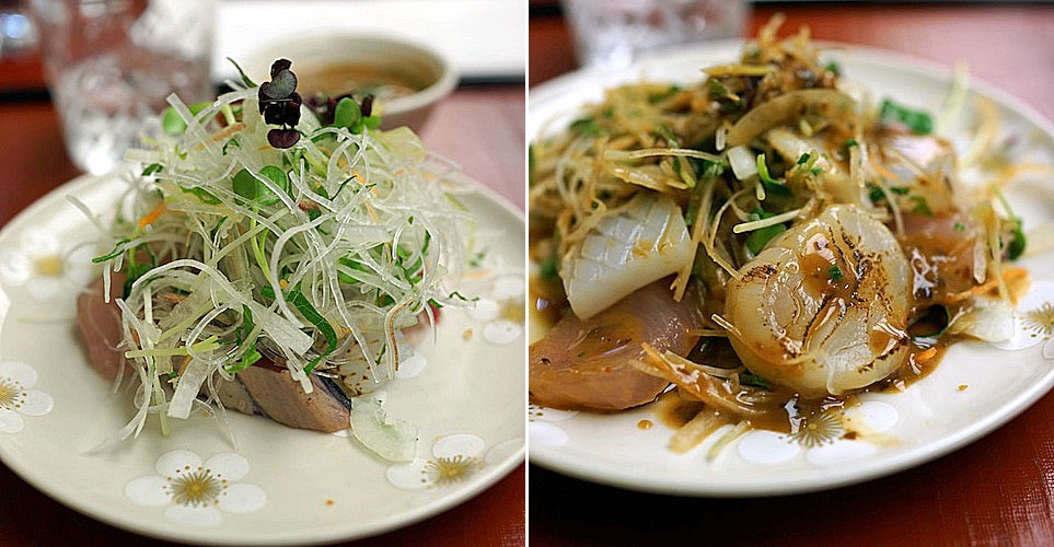 刺身が来ます…、軽く炙った帆立貝、カンパチ、ヒラメを魚の切り身を皿にしき、そこに千切りにした野菜をタップリ。