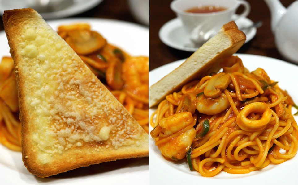 サイドに付いているのがココの自慢のパンを使ったトースト。その表面にはパルメザンが溶けてかたまりこびりつき、サクサク、それを齧りつつ食べるとナポリタンの味が完成しているところが小粋でいいね。納得しました、オゴチソウ。