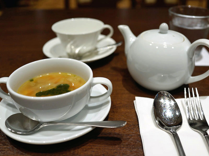 ポットに入った紅茶にスープ。パスタ用のフォークにスプーンがやってきて、テーブルの上が整ってくる。