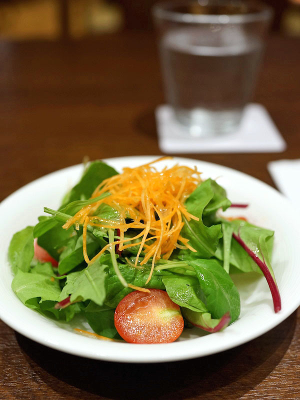 まずはサラダがやってきて、キリッと冷えた葉っぱ野菜に軽い味わいのドレッシングの相性がよく、お腹が正しくすいてくる。