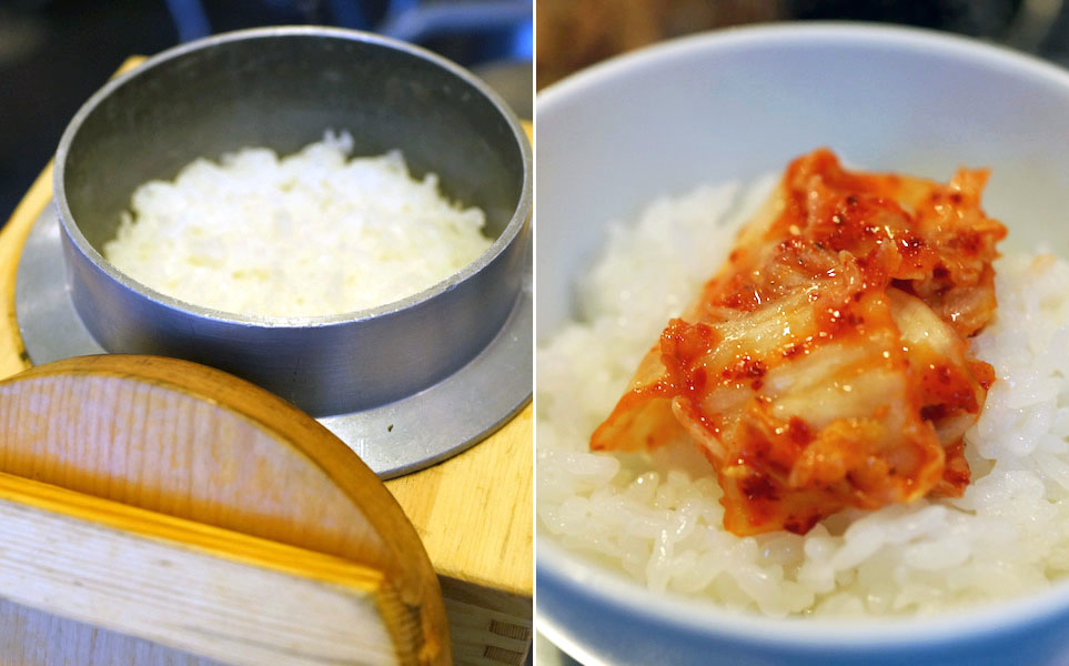 ご飯の粒がキレイにたって、ピカピカ光った銀シャリが、湯気の中から姿をあらわす。海苔にキムチがセットです…、って一緒に来ます。