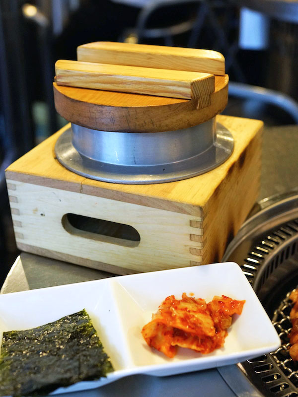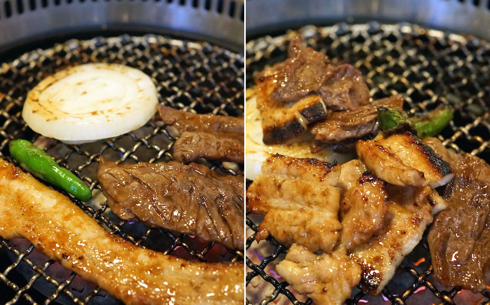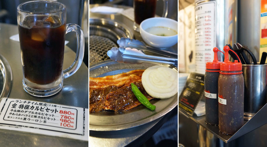 真ん中にロースターを埋め込んだ丸いテーブル、そのテーブルの脇にはしゃもじや箸にお皿にタレがあれこれ。小さな店とテーブルを立体的に上手に使った店作り。