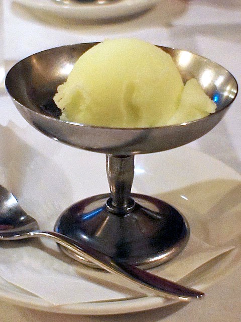 食後にもらえるシャーベットも、ゆずの風味のクラシックなモノ…、それが入ってやってくる洋白の器がこれまたなつかしく、1時間とちょっとで全てが幕に向かってなだれ込んでく、その勢いがおいしくて、この店、かなりの回転数です。