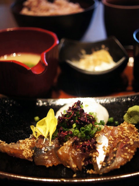 脂ののったサバを甘めのタレに漬け、胡麻をちらして擦った自然薯と一緒に食べる。