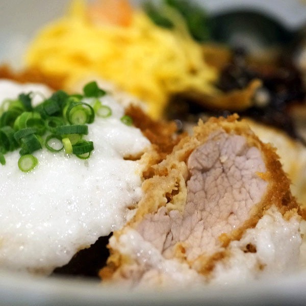 サイドにきんぴらゴボウや昆布の佃煮、刻んだ青菜に錦糸卵と見た目はまるで、とんかつ弁当を丼ご飯の上で再現したようなそんな仕上がり。