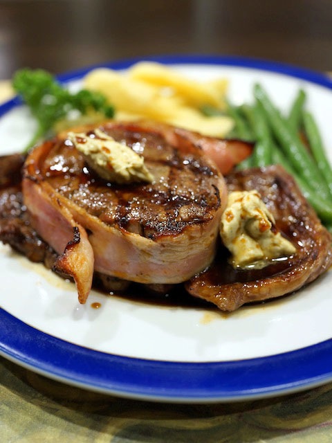 醤油のタレとスパイシーなメンテルバター、フライドポテトにボイルした豆…、どれもが肉のおいしさを引き立ておいしくしてくれる。