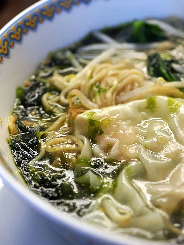 生の青のりが風味をそえて、ペロンとなめらかな薄皮で包まれほんのり、ピンクに染めるエビのすり身のワンタンがツルツルスベスベ、喉越し抜群。