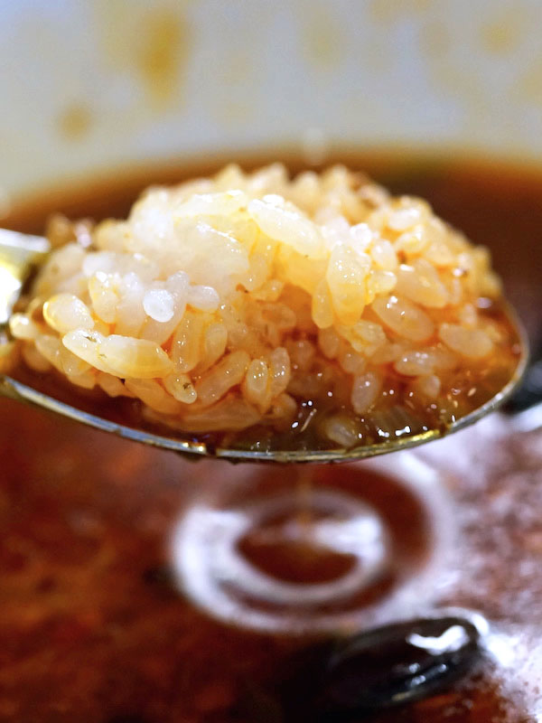 麺や具材をキレイに食べて、そこにスプーンにご飯をのせて、スープに浸してパクリと食べる。麺と一緒に食べるより辛味がクッキリ、輪郭感じるほど鮮やかに舌の上を転がる感じがまたオゴチソウ。スープの上に浮かぶ波紋も目のゴチソウで、腹満ちる。
