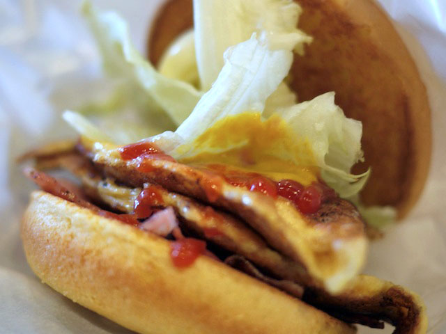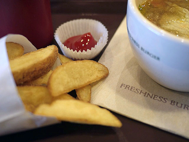 ベーコンオムレツバーガーをメインにとって、フライドポテトとスープをつける。