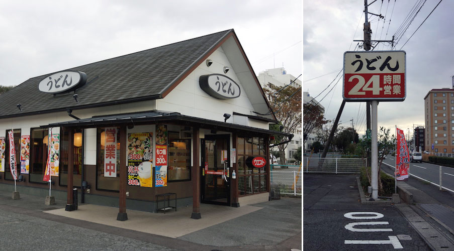 うどんのウェスト。焼き肉ウェストが一緒に出店してて、うどんのウェストはなんと24時間営業。