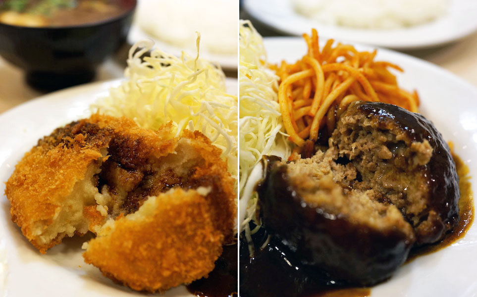 そのハンバーグに揚げたてコロッケ。千切りキャベツにナポリタン。
