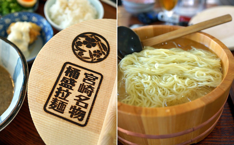一転、冷たい麺の提案をしてみました…、って、木桶の蓋をとると中に氷水、上にユッタリ麺が泳いでそれを冷たいスープにつけて食べるまるで冷麦みたいな涼しい提案。