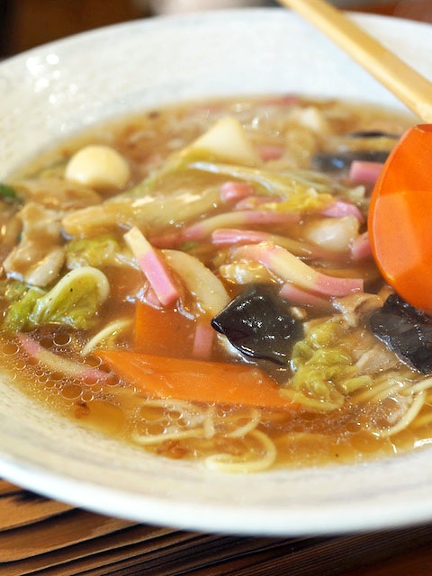 五目あんかけラーメンで、きくらげ、かまぼこ、白菜、人参。