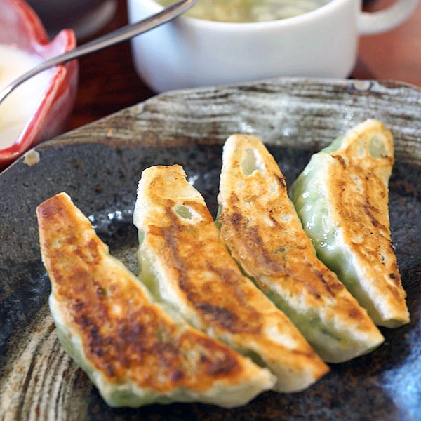 肉を使わず、野菜だけを使った餃子でだから餃子の皮が透けて、中の緑がみてとれる。