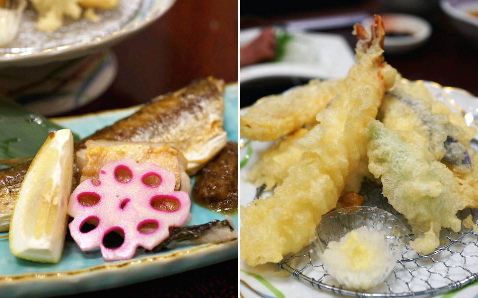 焼いた魚に盛り合わせにした天ぷらと、今日はおいしい日本料理を食べてやるぞとやってきた、その食卓にあってほしいものがすべて揃っているのもステキ。