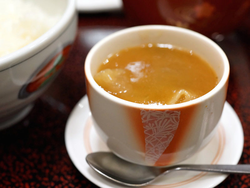 それで茶碗蒸しにしてみました…、とやってきたのが醤油風味のあんかけの中に小さなフカヒレが一枚のっかる。しかも茶碗蒸しの中にはタラバの脚肉が一本入った上等にして美味なる一品。