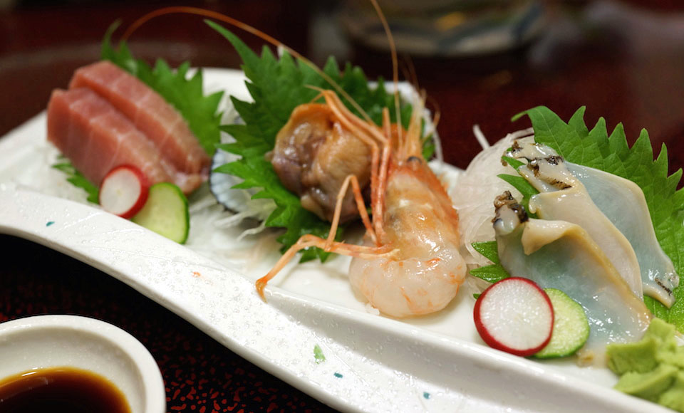 まずは刺身をと、アワビに一度も凍ったことのないボタンエビに赤貝、それから塩竈にあがったメバチマグロがズラリとならぶ。