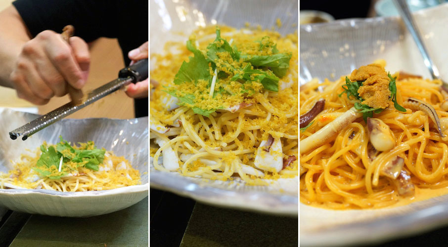 とはいえ、パスタも魚がおいしい居酒屋ならではの商品づくり。イカをくわえたペペロンチーノに、これでもかってカラスミ削る。