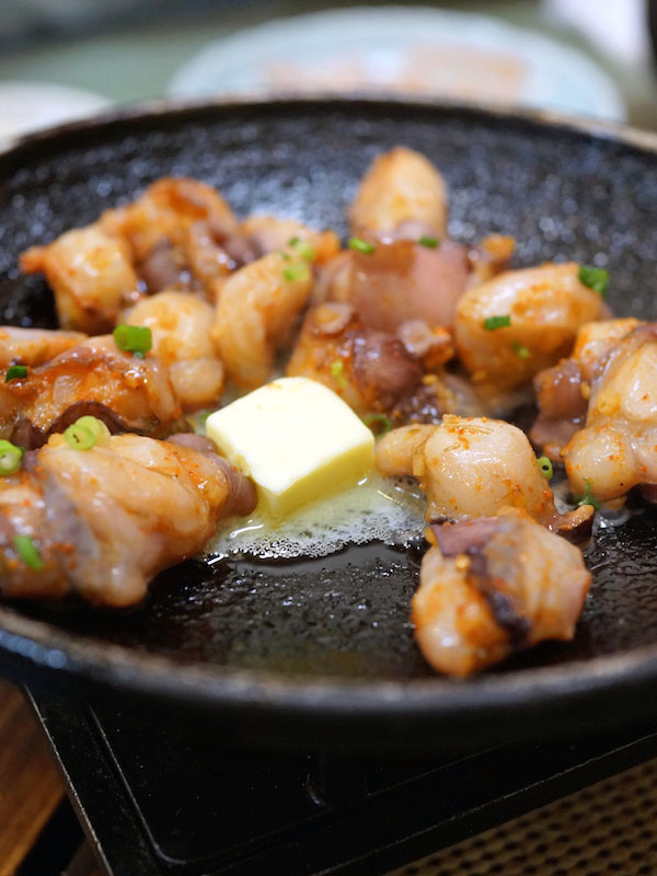 生のタコに赤唐辛子やニンニクで作ったタレをグイグイ揉み込み染み込ませ、焼いた陶板の上でバターと一緒に炒める。