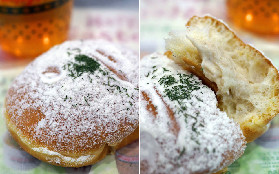 コロンとまんまる。ここのオリジナル・グレーズドの形をしていて、けれど表面は粉糖じゃなく粉チーズ。割ると中からたっぷりツナのマヨネーズあえ。生地も甘さ控えめで、ツナの風味が引き立つ工夫。