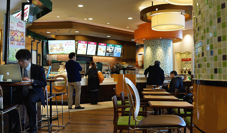 なんだかボクにとって移動の合間の乗り換え時間は、お茶をたのしむ時間のようになっていて、せっかくだからオキニイリの場所…、とそれでクリスピークリームドーナツにくる。