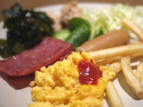 料理もハム、ソーセージにスクランブルエッグと、アメリカンブレックファスト的料理はしっかりそろいはするけど、それ以外には煮物に漬物。